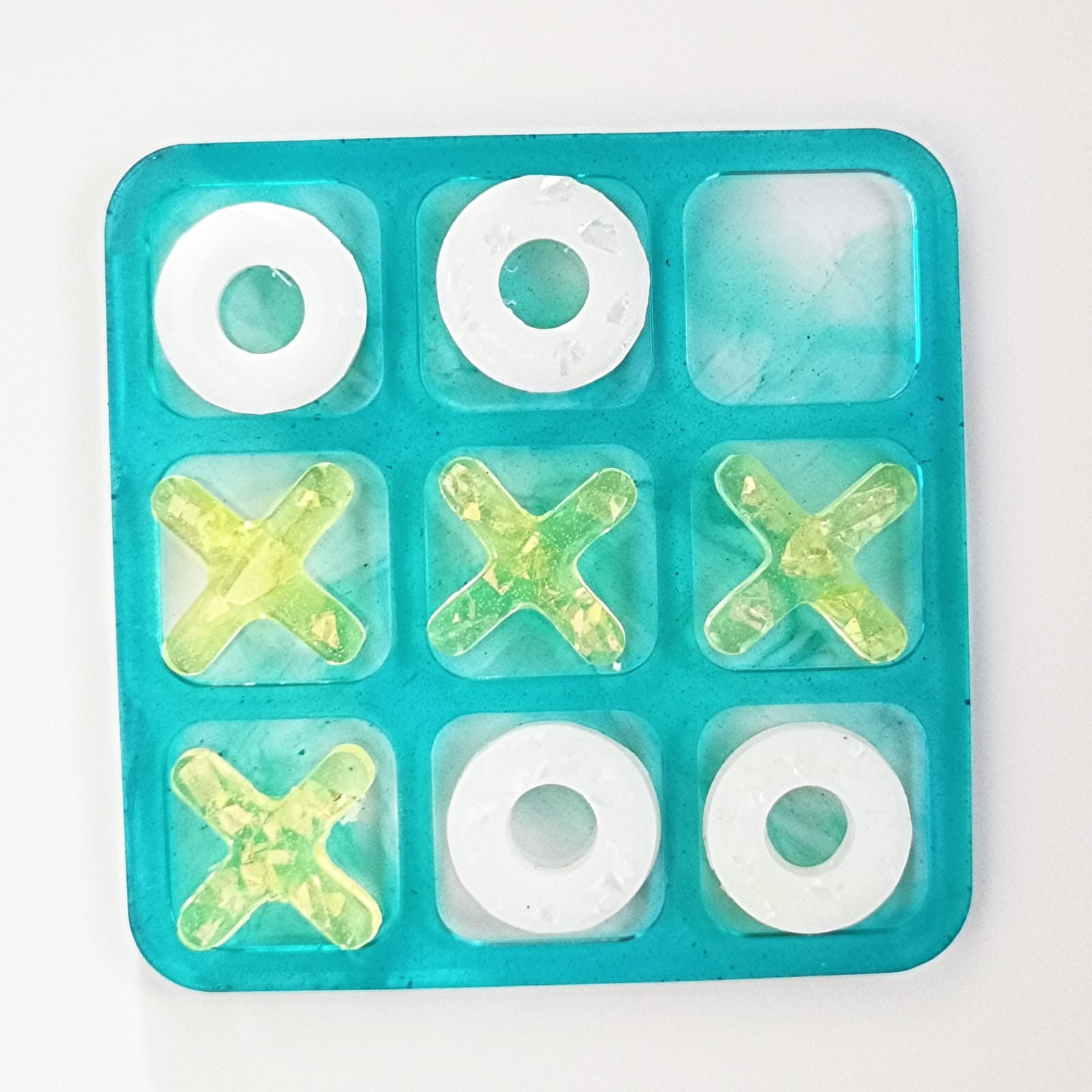 Juego de 3 en raya confeccionado artesanalmente con resina UV, no toxica. Piezas separadas. Medida 9.5×9.5 cm. Ideal para el momento de los juegos de mesa en sus reuniones familiares. Bea. Islas Canarias.